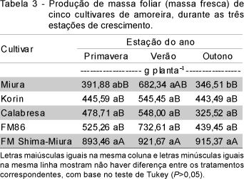 Dentro de cada estação, as produções de massa foliar dos cultivares 'Korin', 'Calabresa' e 'FM 86' não diferiram entre si (P>0,05) nem da verificada em 'Miura'; entretanto, foram inferiores a 'FM Shima-Miura' (Tabela 3).