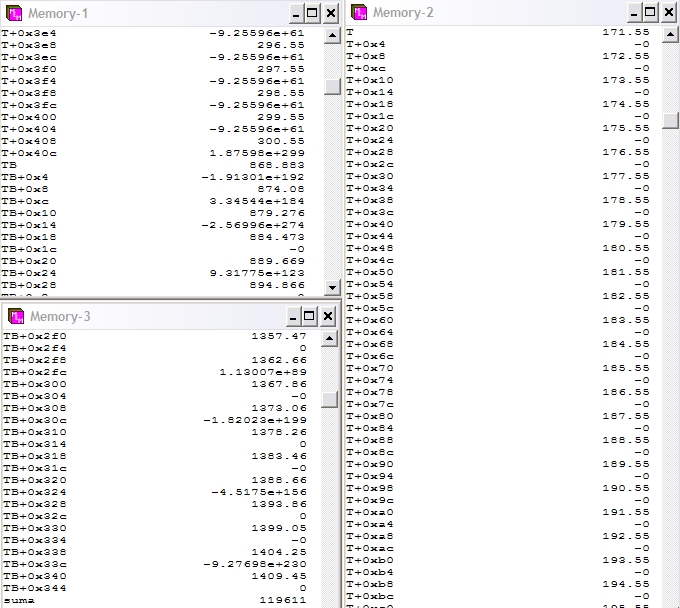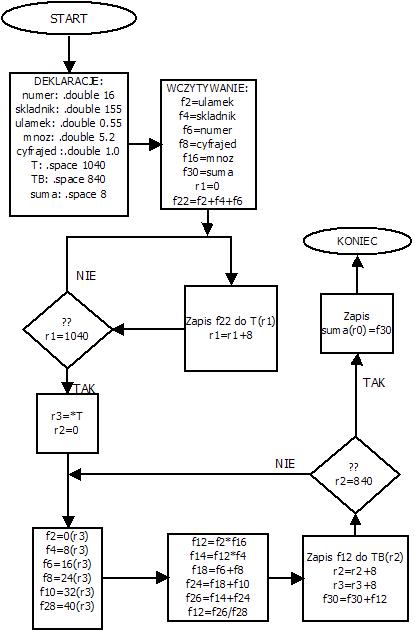 Zadeklaruje dwie tablice przechowujące liczby zmiennoprzecinkowe podwójnej precyzji: T 130- elementową oraz TB ROZMIAR-elementową, a także zmienną Suma zmiennoprzecinkową podwójnej precyzji.