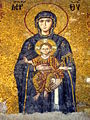 Ta pochodząca z 944 roku mozaika została ponownie odkryta w 1849 przez braci Fossati w trakcie wykonywanego przez nich remontu świątyni. Znajduje się ona w wewnętrznym narteksie, nad wejściem południowo zachodnim, naprzeciw mozaiki Pantokratora z cesarzem Leonem VI. Matka Boska siedzi na tronie bez oparcia, jej stopy zaś opierają się o piedestał wysadzany drogimi kamieniami. Dzieciątko Jezus siedzi na jej kolanie udzielając prawą ręką błogosławieństwa, a w lewej trzymając zwój. Postacie te otacza dwóch cesarzy. Po lewej stoi Konstantyn I Wielki który prezentuje Maryi model nowego miasta – Konstantynopola, po prawej zaś Justynian I Wielki prezentujący model Hagii Sofii.