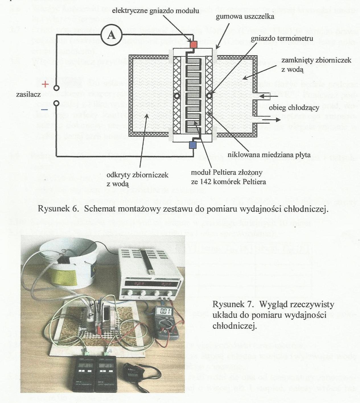 Celem ćwiczenia było określenie wydajności chłodniczej pompy , współczynnika wydajności chłodniczej . Do tego celu użyliśmy pompy cieplnej z łaźniami wodnymi po obu jej stronach, napełnionymi wodą o tej samej temperaturze. Podczas eksperymentu dokonuje się w funkcji czasu równoczesnych pomiarów temperatur Tgrz i Tchł obydwu stron modułu a także napięcia zasilania U oraz prądu I płynącego przez moduł.