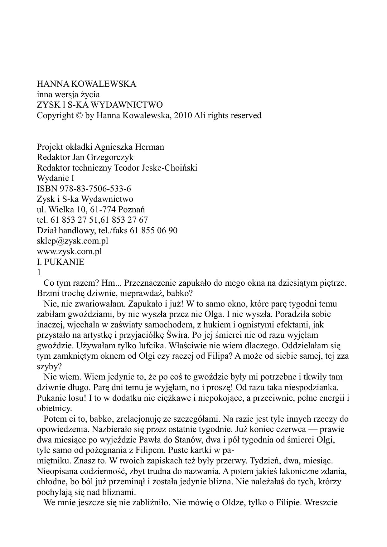 przestraszyć, że mnie za bardzo obciąży tym, co miał za plecami. Popija i zastanawia się, czy to wszystko ma sens. Chciałby mi dać same najlepsze rzeczy, a ma do dania syberyjską biel, niepoprzecinane więzy i złe związkowe nawyki. Pije i bada, ile tego jest. I wątpi, bo widzi tego coraz więcej. Sens zgubiony wśród intryg i pustki po śmierci matki. Przegapiłam to, zajęta Paulą. Nie zauważyłam pod uśmiechniętą