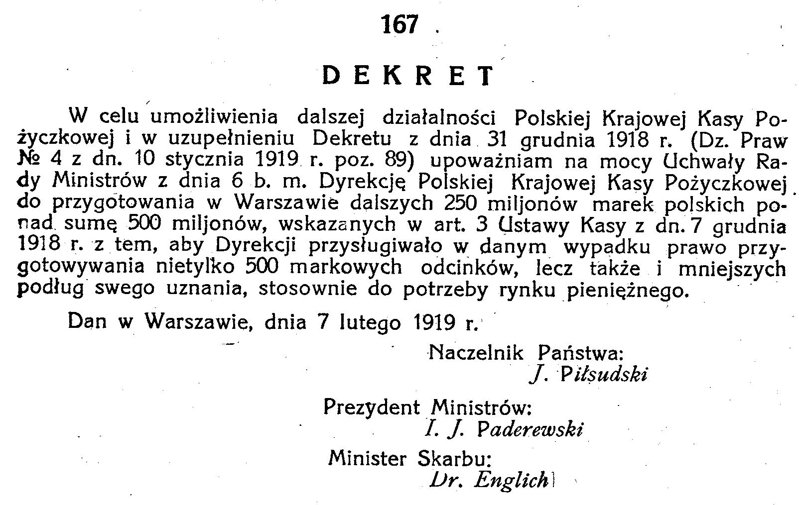 D19190167 Dekret w przedmiocie upoważnienia dyrekcji Polskiej Krajowej Kasy Pożyczkowej do przygotowania 250 000 000 marek polskich