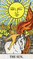 Karta Słońce - Następuje sytuacja przejścia na zupełnie inny poziom. Tak jak sytuacja związana z karta Księżyca zamykała pewien cykl, zamykała cykl zodiakalny tak Słońce zamyka cykl planetarny. Jest to siódma, ostatnia planeta , jest to Słońce , co również oznacza litera Resz – głowa, słońce w w rozszerzeniu w języku hebrajskim jeszcze oznacza „początek,’, „być na czele „, mieć zmysł przywódczy”, poziom intelektualny. Wartość liczbowa 200. Tej litery wskazuje również już na pewien poziom podwyższony. To już jest ta druga setka. W karcie Słońca w wielu taliach jest zawsze zaznaczone dwie istoty –nie dwie osoby bo pojawia się również symbol konia czy zwierzęcia. W zależności od tego jakiego rodzaju jest to przekaz artystyczny. Ale tak naprawdę istotę karty Słońca oddaje tylko i wyłącznie tarot marsylski.