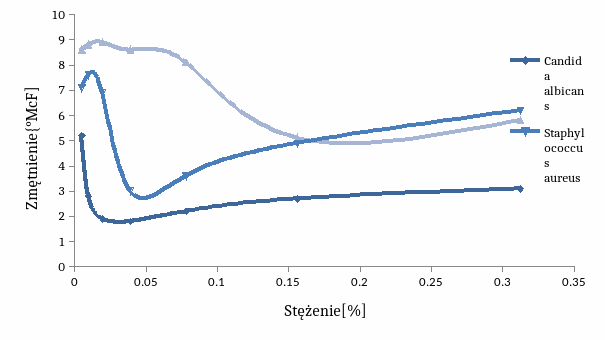 Zarówno z wykresu jak i z tabeli możemy odczytać, przy jakim stężeniu zmętnienie było najniższe, co oznacza najefektywniejsze działanie środka i zahamowanie wzrostu drobnoustrojów. Dla drożdży i Staphylococcus aureus jest to wartość 0,04 %. Dla Escherichia coli wartość stężenia środka przy którym wzrost był najmniejszy wyniosła 0,156%. Pomiar ten nie jest do końca wiarygodny, ponieważ pomiar zmętnienia może być zawyżone ze względu na pożywkę przy niższych stężeniach, a także ze względu na obecność drobnoustrojów przy stężeniach wyższych środka dezynfekującego.