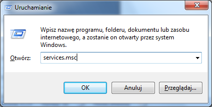 W polecenie „uruchom” wpisujemy „services.msc” po czym uruchomi się nam menadżer usług
