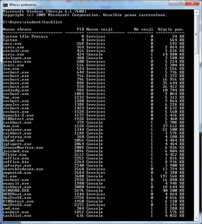 W wierszu poleceń jest świetnie przedstawiona lista usług która jest uruchomiona. Mamy dokładnie podpisane, która usługa pobiera ile pamięci oraz z jakimi procesami jest powiązana.