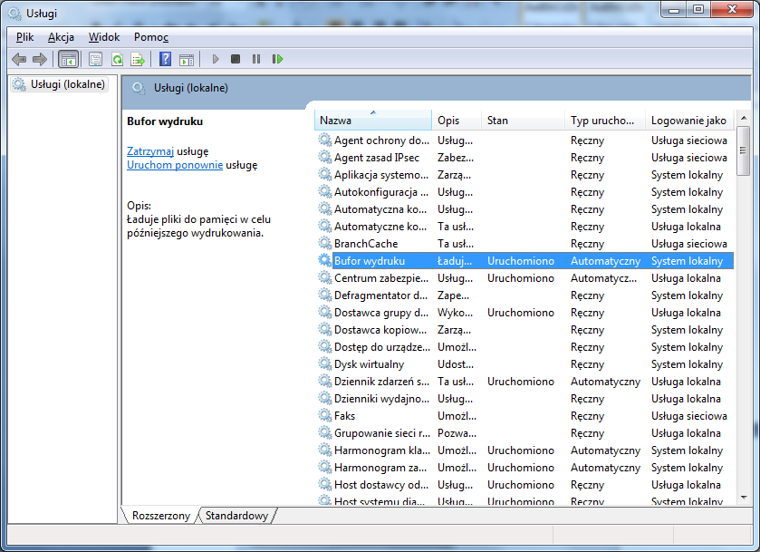 W tym oknie możemy bez problemu zarządzać wszystkimi usługami. Mamy bardzo wyraźnie przedstawione stany usług jak i ich funkcje po kliknięciu na wybraną usługę mamy jej dokładny opis po lewej stronie okna.
