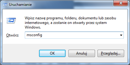 W polecenie „uruchom” wpisujemy „msconfig” po czym uruchomi się nam konfiguracja systemu.