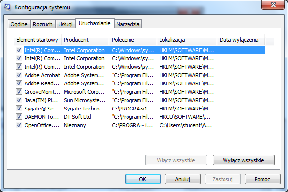 Do dyspozycji mamy także zakładke uruchom w której mamy wypisane aplikacje/usługi które włączają się bezpośrednio po starcie systemu. Część z tych usług można odznaczyć (wył.) np. programy których nie używamy za każdym włączeniem komputera to znacznie przyspiesza włączanie się samego komputera jak i dalszą prace w systemie.