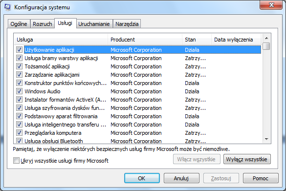 W aplecie konfiguracja systemu wybieramy zakładkę usługi, w której mamy zaprezentowane które aplikacje działają a które są wyłączone oraz czy są powiązane z firmą Microsoft.