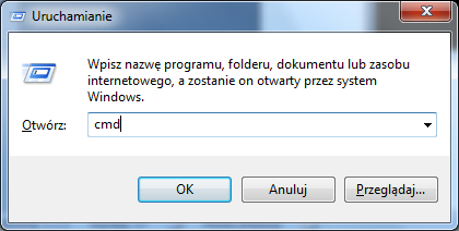 W polecenie „uruchom” (znajdujące się w pasku start) wpisujemy „cmd” co uruchomi nam wiersz poleceń (można go także uruchomić po przez: start - >wszystkie programy - >akcesoria - >wiersz poleceń).