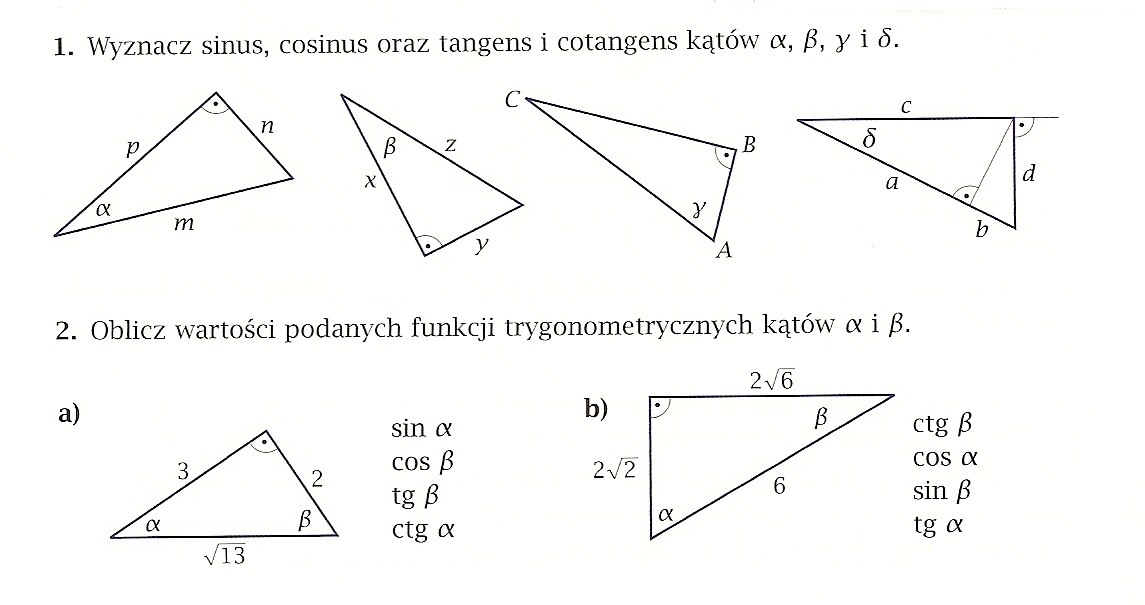 • Opisać słownie i symbolicznie sinus, cosinus i cotangens kąta ostrego w każdym trójkącie prostokątnym.