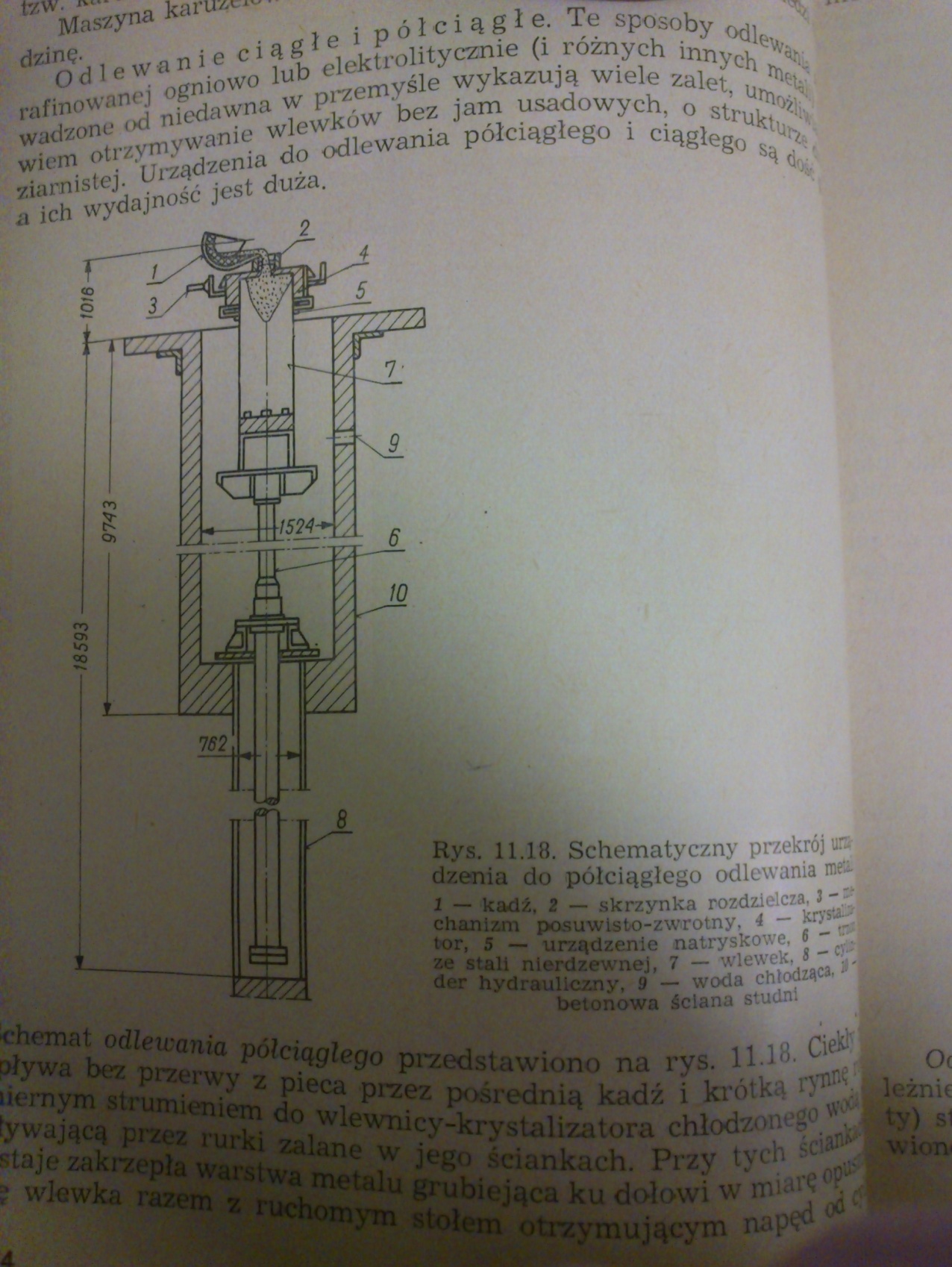 1-kadź, 2-skrzynka rozdzielcza, 3- mechanizm posuwisto-zwrotny, 4-krystalizator, 5- urządzenie natryskowe, 6-trzona ze stali nierdzewnej, 7- wlewek, 8-cylinder hydrauliczny, 9- woda chłodząca, 10- betonowa ściana studni.