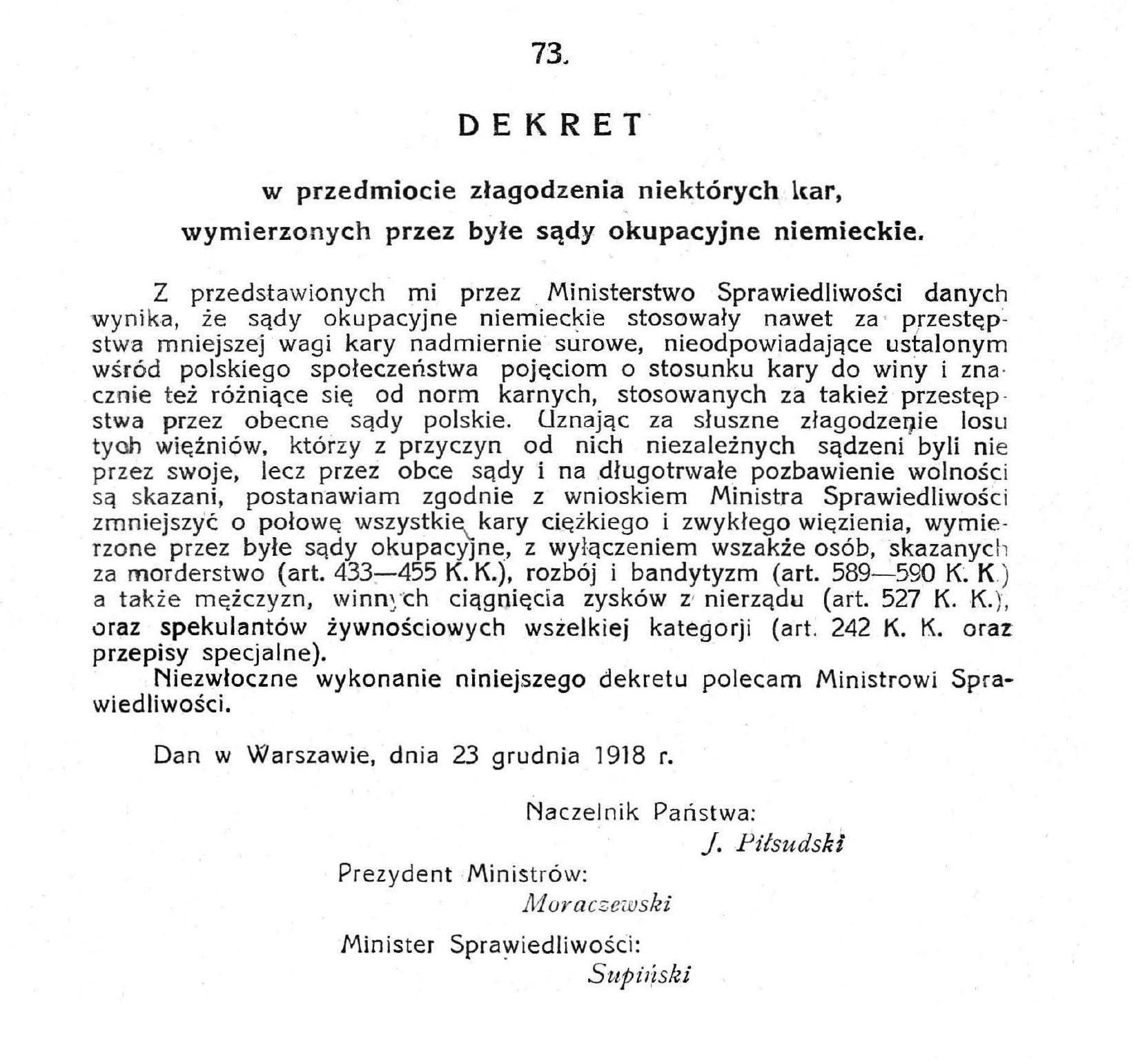 D19180073 Dekret w przedmiocie złagodzenia niektórych kar, wymierzonych przez byłe sądy okupacyjne niemieckie
