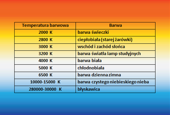Podawana przez producentów wartość wyrażana jest w Kelvinach. Im wyższa wartość tym zimniejsze światło jest emitowane. Dla porównania barwa światła słońca wynosi około 6500 K, zwykłych żarówek 2500-2700K, a w przypadku LEDów wszystko zależy od modelu, jednak rzadko jest mniejsza niż 3000 K. Do zimniejszego światła należy się przyzwyczaić i niestety duża część osób czuje pewnego rodzaju dyskomfort po zmianie typu oświetlenia.