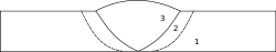 Strefy złącza spawanego. 1 - Materiał podstawowy, 2 - Stefa wpływu ciepła, 3 - Spoina