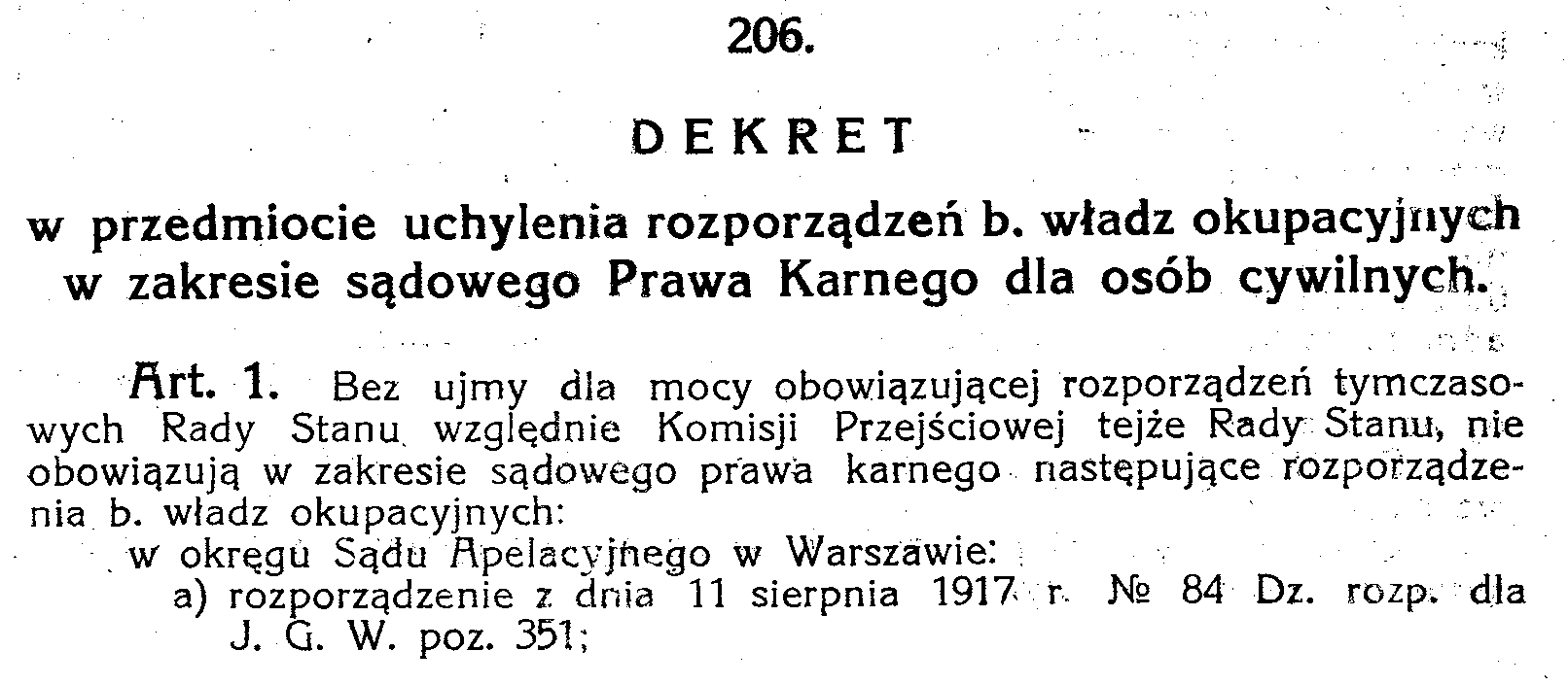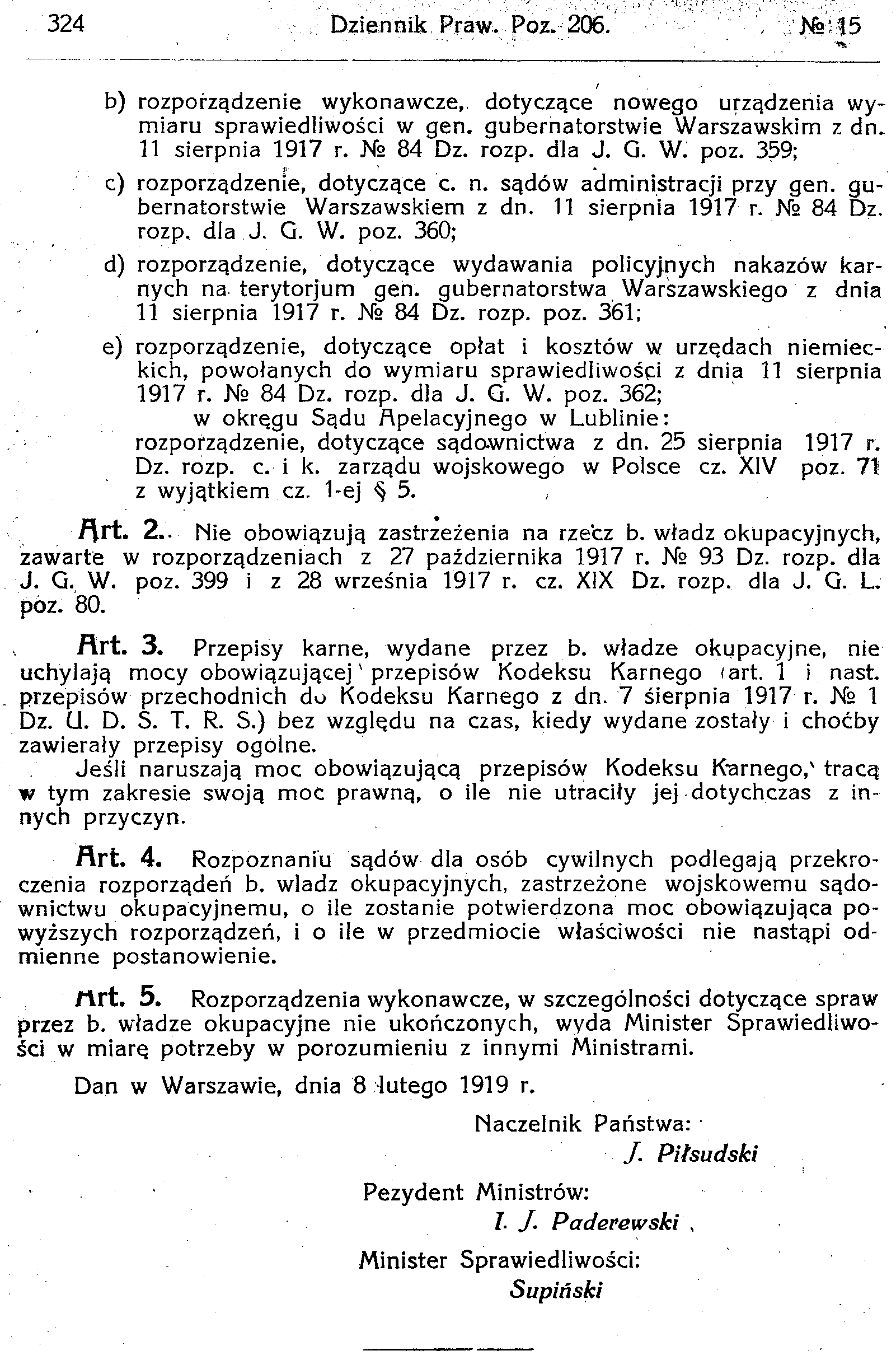 D19190206s Dekret w przedmiocie uchylenia rozporządzeń b władz okupacyjnych w zakresie sądowego Prawa Karnego dla osób cywilnych