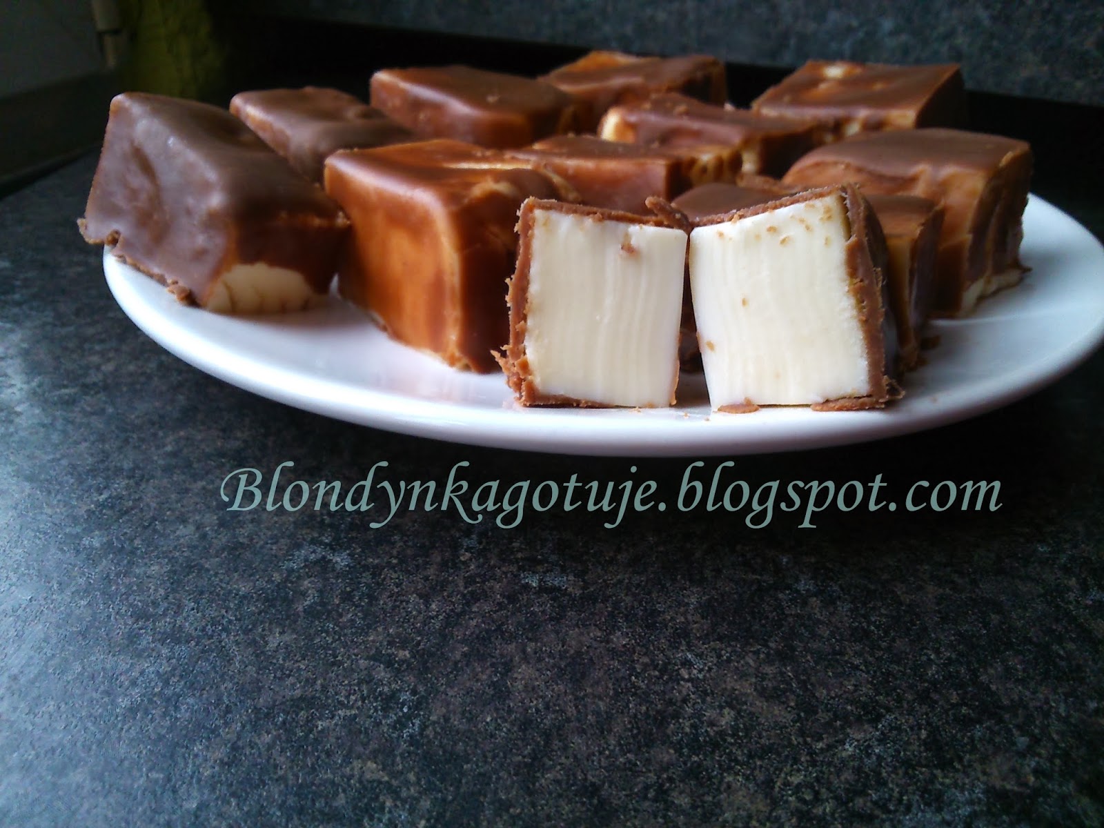 Kiedy masa stężała zabieramy się za przygotowanie polewy. Czekoladę siekamy, masło kroimy w drobne kawałki i roztapiamy na parze oba składniki razem. Stężałą masę kroimy na małe prostopadłościany (mniej więcej 4*1,5 cm), które oblewamy polewą czekoladową. (A polewa to po prostu czekolada i masło roztopione w kąpieli wodnej). Ponownie wstawiamy do lodówki, aby czekolada zastygła.