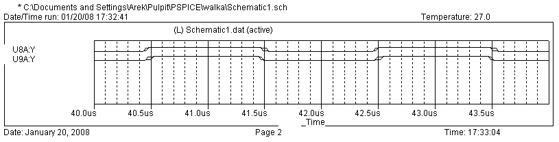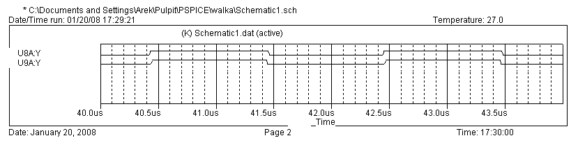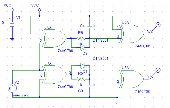 Sygnał PWM ( na rysunku ze źródła V2 ) podany jest na bramkę U6A i U6B. Ze względu na podłączenie jednego wejścia do dodatniej szyny zasilania bramka U6A działa jak inwerter, natomiast U7A przenosi poziomy logicznie bez zmiany. Zbocze narastające na wyjściu bramki U6A za pośrednictwem diody Schottkiego przeładowuje pojemność C4, natomiast opadające przeładowuje pojemność C4 przez rezystancje R6. Efektem tego jest opóźnienie zbocza opadającego. Analogiczna sytuacja ma miejsce w dwóch dolnych bramkach. Rysunek 9 przedstawia stany wyjściowe przy wartościach R=1KΩ i C =1nF, czas opóźnienia wynosi około 20 ns, ale już dla C = 5n ( Rysunek 11 ) widać wyraźnie utrzymujące się stany nieustalone. W związku ze stanami ustalonymi ten układ nie został wykorzystany do ostatecznej wersji schematu wzmacniacza.
