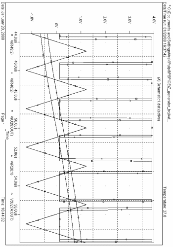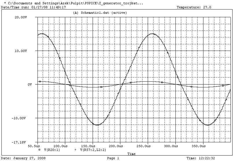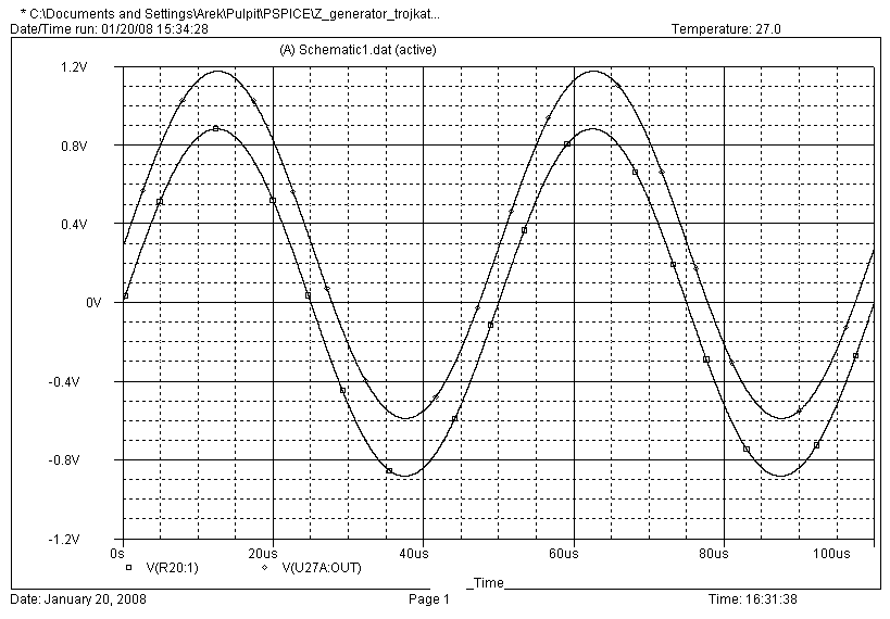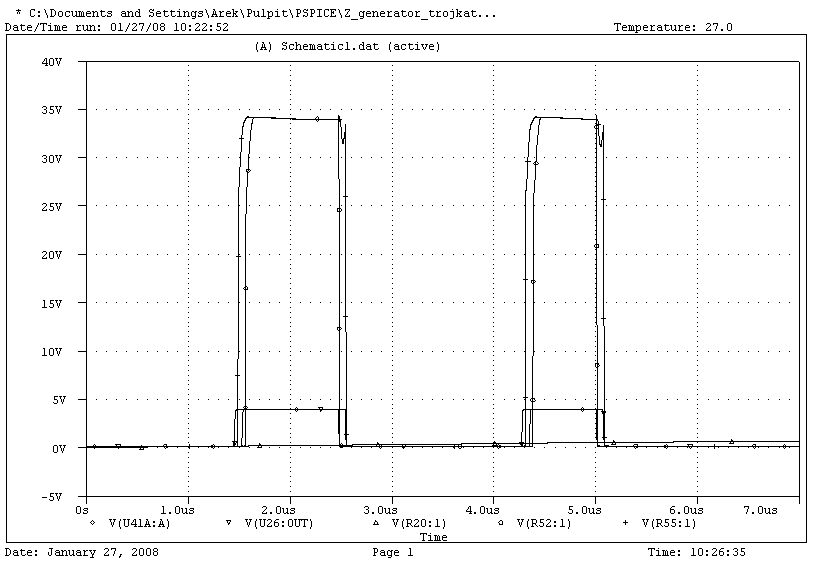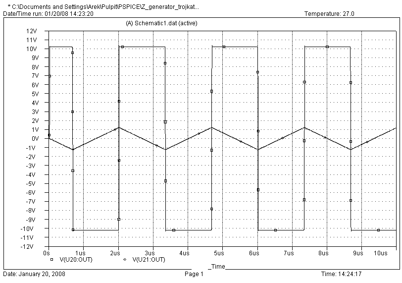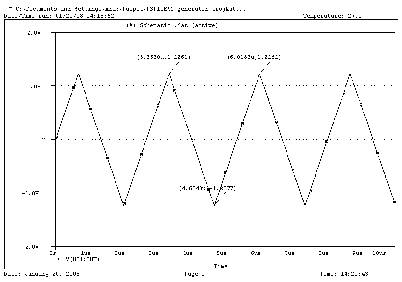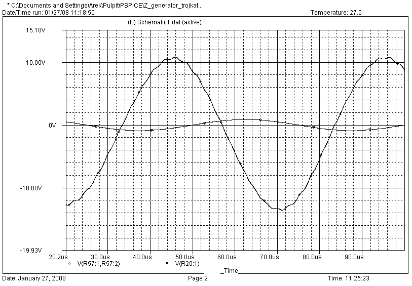 Na rysunku 4 przedstawiony jest wykres sygnału wyjściowego generatora. Rysunek 5 przedstawia wykres napięcia wyjściowego generatora oraz prostokątny przebieg wyjściowy z przerzutnika Schmitta U20. Jak widać wybór wzmacniacza operacyjnego o bardzo dużym slew rate ( 8000V/µs ) skutkuje bardzo stromymi zboczami i szybkim przełączaniem. Jakoś uzyskanego sygnału jest bardzo dobra. Rynkowa cena Ad8001 wynosi około 40 zł w handlu detalicznym, ale stosunek jakości do ceny tego układu jest bardzo korzystny. Uzyskany układ ma częstotliwość zależną głównie od stałej RC, w praktycznej realizacji należałoby więc zastosować stabilne elementy z szeregu 1%, chociaż częstotliwość tego generatora nie jest krytyczna. Odchylenie rzędu 10…20% najprawdopodobniej nie pociągnie za sobą zauważalnych konsekwencji.