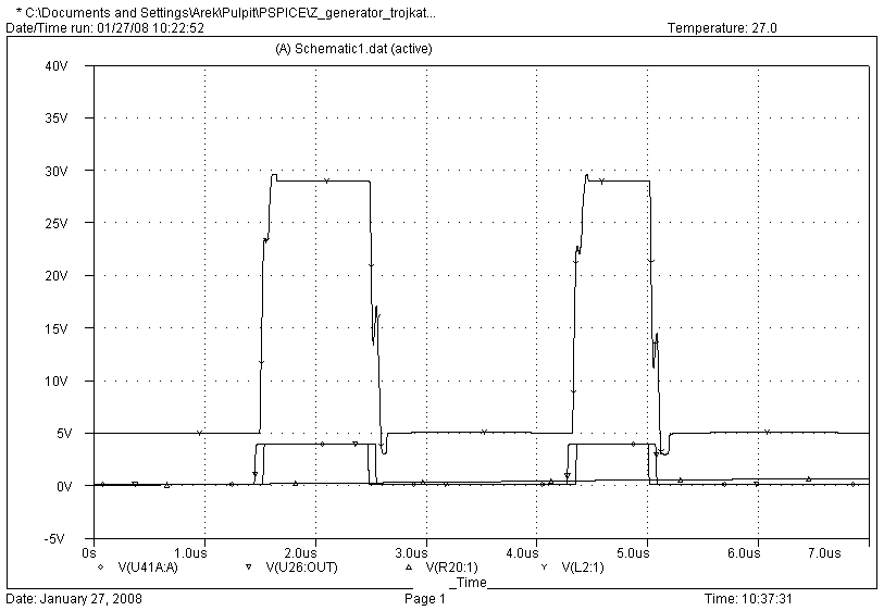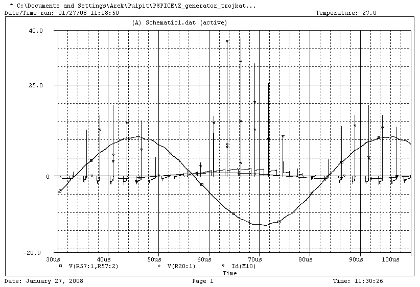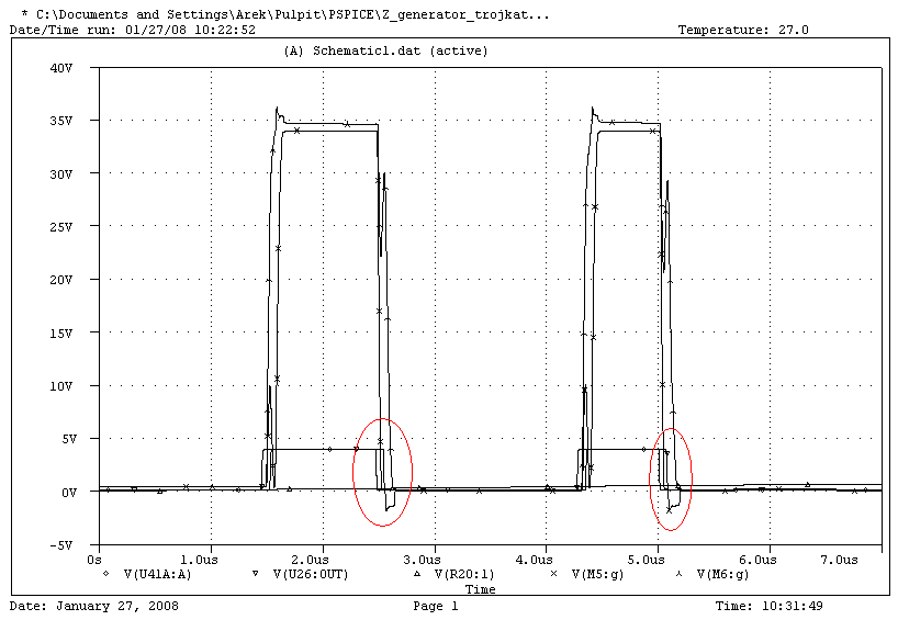 Na rys. 19 przedstawione są przebiegi sterujące z wyjść komparatorów oraz przebiegi napięć na kolektorach Q17 i Q18. Jak widać czas wyłączania tranzystorów jest znacznie większy niż czas włączania. Rys. 20 przedstawia przebiegi sygnałów z wyjść komparatorów i na bramkach tranzystorów mocy. Widoczne są pewne zniekształcenia, i niedoskonałość zboczy. W praktycznej realizacji należałoby zastosować szybsze tranzystory. Okręgami zaznaczone są miejsca w których sygnały sterujące dla tranzystorów mocy są nieprawidłowe. Czas ich trwania wynosi około 10[ns] i w tych warunkach tranzystory mocy nie wykraczają poza obszar bezpiecznej pracy, ale układ nie jest optymalny. Na rys. 21 widoczny jest poziom napięcia wyjściowego pojedynczego stopnia mocy. Na rysunku 22 przedstawiono napięcie wyjściowe na obciążeniu 8[Ω] przy wysterowaniu wzmacniacza bliskim 85%, i częstotliwości sygnału 20[KHz]. Wyraźnie widoczne staje się przesunięcie fazowe wprowadzane przez wzmacniacz, oraz pewien brak symetrii sygnału względem zera. Na rysunku 23 przedstawiono tą samą sytuację co na rysunku 22, ale dodatkowo pokazano prąd płynący przez tranzystor mocy w lewej górnej gałęzi układu H. Widoczne impulsy prądowe nie są niebezpieczne dla tranzystora ponieważ dla IRF520 maksymalny prąd impulsowy wynosi około 40A. Średnia moc skuteczna wydzielona na pojedynczym tranzystorze nie przekracza 1,2[W], podczas gdy na obciążeniu moc skuteczna wynosi około 50[W]. Tranzystory mocy są cztery, czyli w tym wypadku sprawność stopnia mocy (Sprawność wzmacniacza praktycznie jest determinowana przez sprawność stopnia mocy)