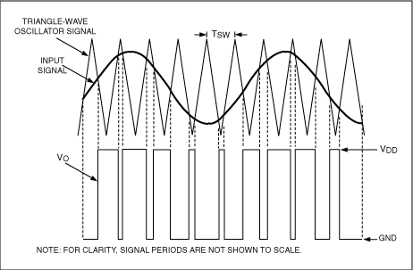 Rysunek 2 obrazuje porównywanie sygnału trójkątnego z sygnałem analogowym na wyjściu, jak łatwo zauważyć pożądany jest jak najszybszy sygnał trójkątny, widać także że każda nieliniowość zboczy daje o sobie znać w postaci nieliniowości wzmacniacza. Typowe częstotliwości sygnału trójkątnego dla wzmacniacza audio ( do 20KHz ) są rzędu 300KHz do około 600KHz