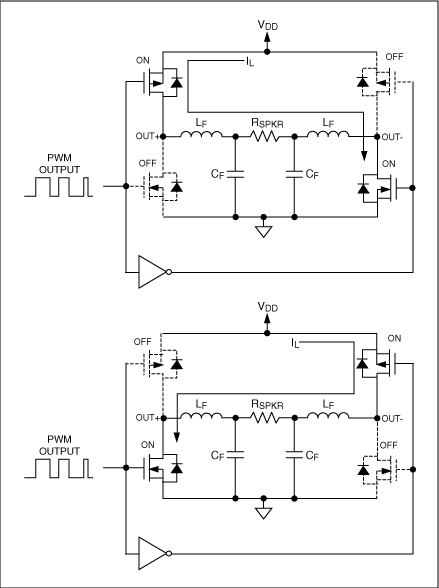 Sygnał audio z wejścia liniowego trafia na jedno z wejść komparatora, gdzie jest porównywany z sygnałem trójkątnym. Sygnał trójkątny musi mieć częstotliwość znacznie większą niż górny zakres przenoszonych przez wzmacniacz częstotliwości. Na wyjściu komparatora otrzymujemy sygnał prostokątny PWM, którego wypełnienie jest proporcjonalne do chwilowej wartości sygnału audio. Wyjście komparatora jest połączone do sterownika tranzystorów wyjściowych. Sterownik tranzystorów końcowych przyjęło nazywać się angielskim zapożyczeniem driver. Driver ma za zadanie zwiększyć amplitudę sygnału z komparatora, tak aby była ona wystarczająca do szybkiego i zatkania i odetkania tranzystorów MOSFET mocy. W punkcie pomiędzy tranzystorami końcowymi napięcie zmienia się impulsowo, i jest w nim zawarta informacja o sygnale analogowym z wejścia. Aby odzyskać kształt, i zachować wierność przetwarzania należy odfiltrować wyższe harmoniczne, dokonuje się tego w najprostszym filtrze dolnoprzepustowym LC ( jest to rozwiązanie optymalne, pomiędzy tródnością wykonania a parametrami ), następnie pojemność COUT odcina składową stałą. Interesującym i jakże ważnym problemem jest nie ujęty na schemacie ideowym blok odpowiedzialny za czas martwy (dead time) pomiędzy wyłączeniem górnego tranzystora mocy a załączeniem dolnego. Czas martwy jest konieczny ponieważ tranzystory mocy wykazują się pewną bezwładnością, bez czasu martwego istnieje ryzyko załączenia obydwóch tranzystorów w tym samym czasie, a to grozi eksplozją stopnia końcowego. Typowa wartość opóźnienia mierzona jest w pojedynczych nanosekundach.