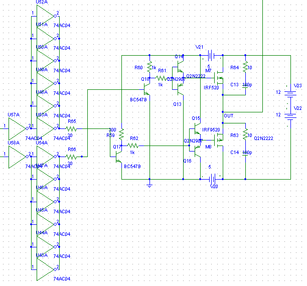 Układ przedstawiony jest na rysunku 17. Aby uniknąć przenoszenia poziomów napięć, postanowiono że masa części cyfrowej czyli układu czasu martwego i komparatorów będzie podłączona do ujemnej szyny zasilania stopnia mocy. W wyniku doświadczeń stwierdzono też że dobrym pomysłem jest przeładowywanie pojemności bramek tranzystorów mocy napięciami w zakresie szerszym niż napięcie zasilania samych tranzystorów mocy. Efektem tych założeń jest szybki driver który dostarcza na wyjściu sygnał prostokątny o amplitudzie około 30 V, przy czym zbocza tego sygnału trwają mniej niż 30ns. Zwielokrotnione bramki TTL szybkiej rodziny AC zastosowano aby nie obciążać zbytnio wyjść komparatora, rezystory R65 i R66 ograniczają maksymalny prąd wyjściowy bramek. Dalszy opis dotyczy sterowania górnego tranzystora z kanałem typu n. Sygnał przez rezystor R65 trafia na bazę tranzystora Q18, kiedy tranzystor jest zatkany to napięcie na jego kolektorze znajduje się na poziomie dodatniej szyny zasilania a otwarcie tranzystora powoduje zciągnięcie kolektora do napięcia bliskiego ujemnej szynie zasilania. Jak widać, tutaj amplituda napięcia została podniesiona z 5 do około 30 [V] Następnie sygnał kierowany jest przez rezystor R61 na przesterowany wtórnik emiterowy którego zadaniem jest dopasowanie impedancyjne i przystosowanie układu do przeładowywania dużej ( około 1nF ) pojemności wejściowej tranzystora IRF520. Dolny tranzystor jest sterowany analogicznie. Cały układ z rysunku 17 stanowi połowę układu H, więc w końcowym układzie pojawia się dwukrotnie.