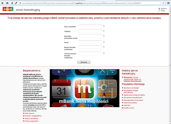 o podanie dodatkowych danych - na prawdziwej stronie banku nie