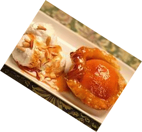 Brzoskwinie sparzyć, obrać ze skórki. Przeciąć na pół i usunąć pestki. Na patelni rozgrzać masło, dodać cukier i podgrzać aż zrobi się karmel. Dodać wino zagotować. Gęsty sos wlać na dno ośmiu foremek. Na sosie położyć połówkę brzoskwiń rozcięciem do góry. Z rozmrożonego ciasta wyciąć osiem kółek i przykryć nimi owoce. Piec w piekarniku rozgrzanym do 200 stopni, aż ciasto zarumieni się i urośnie. Wyjąc z piekarnika, odstawić na 5 minut i obracając do góry dnem, wyłożyć na talerze. Obok dodać jogurt lekko posłodzony cukrem waniliowym i kieliszek słodkiego muscatu.