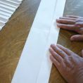 Odwróć kartkę na drugą stronę a następnie odmierz i zaznacz 3,5 cm z drugiej strony. Połóż kartkę złożoną w harmonijkę wzdłuż zaznaczenia i przyklej taśmą klejącą.