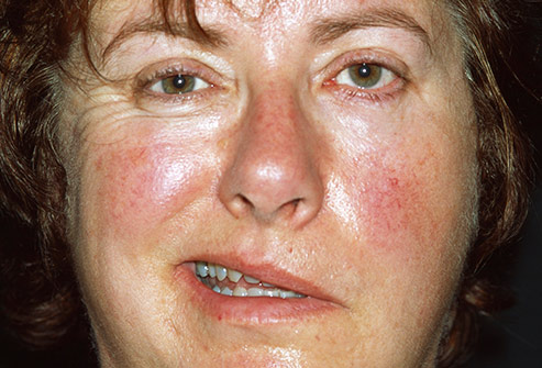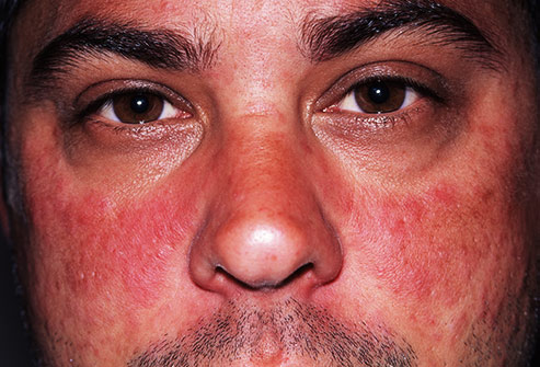 Większość wysypek nie jest poważna i poprawiają się same, ale ta jest niezwykła. Jest na obu policzkach w kształcie motyla, jest powszechnym objawem tocznia. Występuje kiedy układ odpornościowy atakuje własne tkanki i narządy. Możesz też mieć gorączkę, bolące i sztywne stawy, i palce niebieszczeją w zimnie. Skonsultuj lekarza.