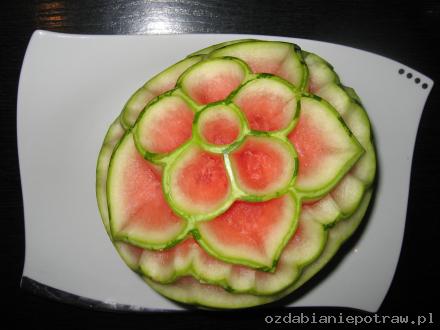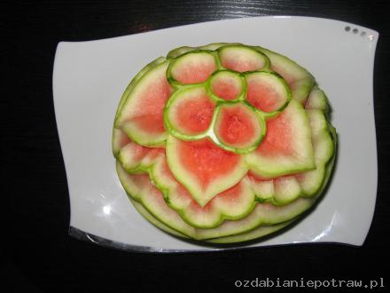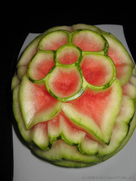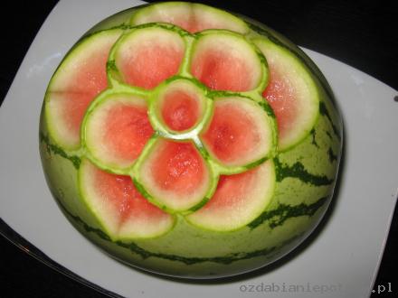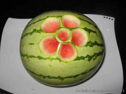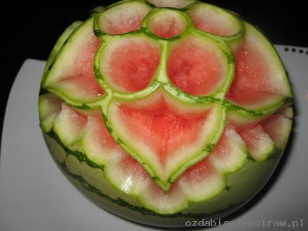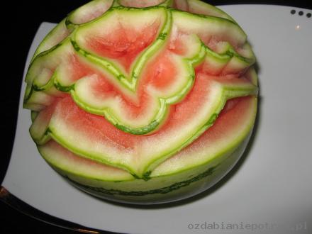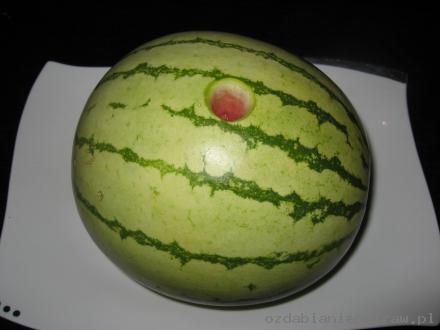 6. Dekoracja gotowa. Można teraz „przycieniować” niektóre elementy – zostawiając np. 0,1 mm zielonej skórki – na ciemnym arbuzie efekt będzie rewelacyjny. Reasumując: wystarczy dobry pomysł, trochę wolnego czasu i ostry nożyk – tak stajemy się mistrzami carvingu.