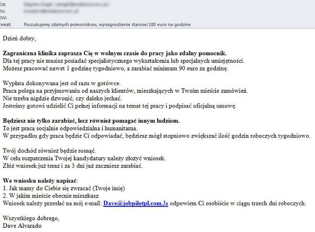 Nieprzeczuwający niczego internauta przesyła więc naprędce swój życiorys na maila przyszłego "pracodawcy". Ten odpisuje, że CV spełnia jego oczekiwania, a do dopełnienia formalności potrzebne są jeszcze jedynie skanu dowodu osobistego i numeru konta osobistego. Praca ma być lekka i przyjemna. Polega np. na przyjmowaniu na swoje konto pieniędzy, a następnie na ich dalszym rozsyłaniu. W rzeczywistości internauta nie jest jednak pośrednikiem w legalnych transakcjach, tylko bierze udział w praniu brudnych pieniędzy cyberprzestępców.