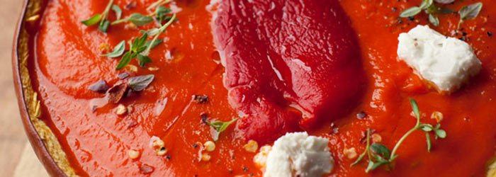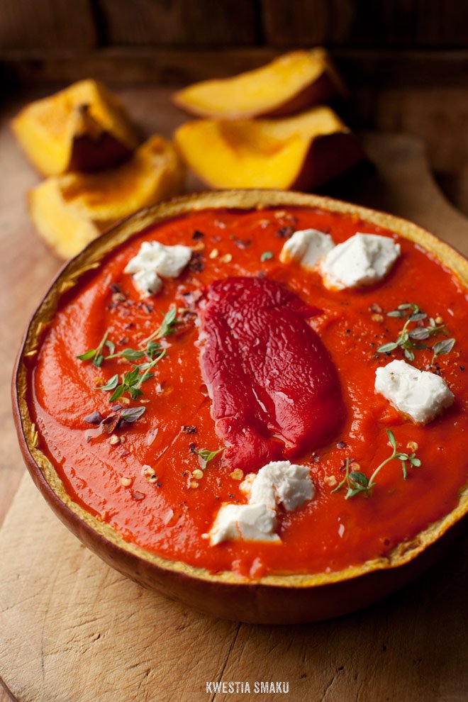 Z pieczonej dyni i papryki, podawana z fetą i tymiankiem.