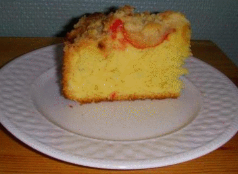 do przygotowanej formy wylac ciasto powciskac owoce posypac wczesniej