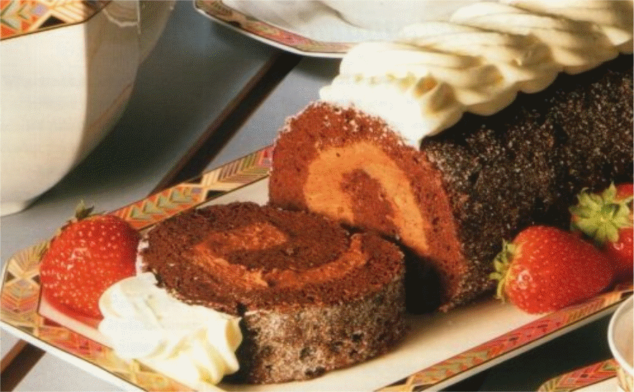 1. Włożyć żółtka do miski, wsypać cukier. Ucierać, aż mieszanina zrobi się gęsta i biała. Mieszając, dodać czekoladę i mieszaninę mączną. 2. Dodać białka ubite na sztywną pianę. Wylać ciasto na natłuszczoną i wyłożoną papierem do pieczenia foremkę o wymiarach 25 x 30 cm i piec 12-15 minut. Przewrócić na ściereczkę kuchenną posypaną cukrem i zwijać od krótszego boku. Odstawić do wystygnięcia. 3. Aby zrobić masę, włożyć czekoladę do małego rondla, dodać śmietanę i podgrzewać na małym ogniu, aż czekolada się stopi. Wymieszać do uzyskania jednolitej konsystencji. Doprowadzić do wrzenia, zdjąć z ognia i odstawić do całkowitego wystygnięcia. Zimną masę przełożyć do miski, miskę postawić na lodzie. Ucierać do uzyskania gęstej, kremowej konsystencji. 4. Rozwinąć ciasto, posmarować masą i zwinąć z powrotem. Podawać pokrojone w plastry.