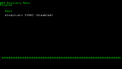 Owa "<spacja> 1" oznacza tyle, że plugin jest aktywowany. 0 oznacza dezaktywacje. Teraz następują pewne rozbieżności. Użytkownicy softu 5.03 GEN-C właśnie tak włączają i wyłączają pluginy, zmieniając wartości 1 i 0. W stałych CFW, nie ChickHENowych jest jeszcze możliwość wejścia do Recovery Menu (R przy włączaniu konsoli) i przejścia do opcji Plugins. Powinni ujrzeć coś takiego: