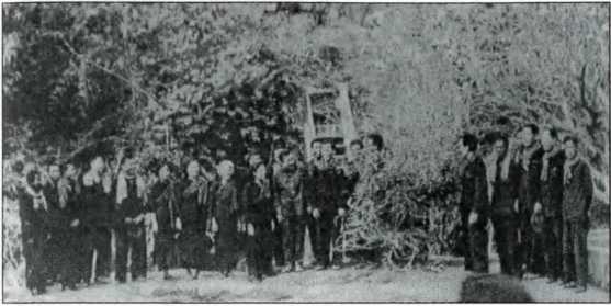 314 Интервью автора с Джеймсом Принглом (февраль 1991). На одном из недатированных моментальных снимков середины 1980-х Пол Пот и его соратники, стоят в ряд; на других снимках они, одетые в нетипичные для них деловые костюмы, позируют в каком-то саду в Пхеньяне.
