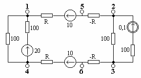 Schemat zastepczy obwodu (z uwzglednieniem wartosci liczbowych), gdy suwaki potencjometrów sa w srodkowych polozeniach, jest postaci Prad I mozna obliczyc najlatwiej metoda „od konca” (patrz zadanie 4). Ponizej przedstawiamy rozwiazanie metoda potencjalów wezlowych – dla oznaczen jak na rysunku.