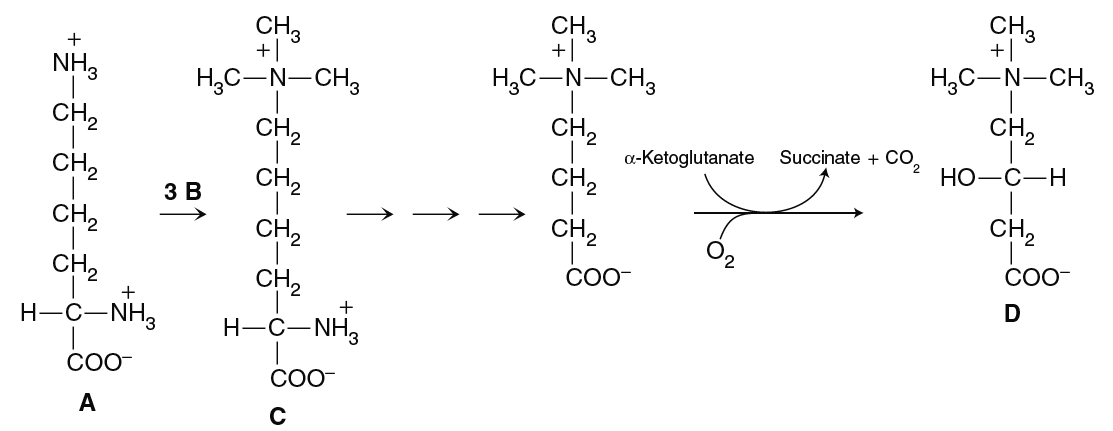 22. The diagram below outlines the biosynthesis of a compound that is required for the oxidation of fatty acids in the mitochondrion.