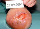 Fot. 1. Pacjent AB – odleżyna na szczycie kikuta przed leczeniem