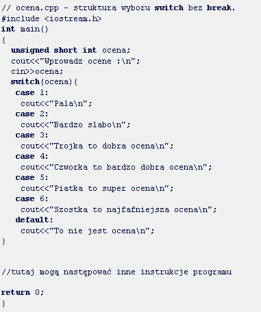 kaŜdą z etykiet case. Jeśli uŜytkownik wprowadził np. 4, wystąpi dopasowanie (case 4:) i instrukcje dla tego przypadku zostaną wykonane (cout<<"Czworka to bardzo dobra ocena\n";) wyświetlony zostanie napis "Czworka to bardzo dobra ocena\n" i nastąpi wyjście ze struktury switch bezpośrednio po instrukcji break;