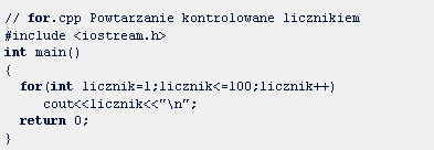 Struktura powtórzenia for jest doskonałym narzędziem wszędzie tam gdzie zachodzi potrzeba powtarzania kontrolowanego licznikiem. W strukturze for wymagane są dwa średniki.