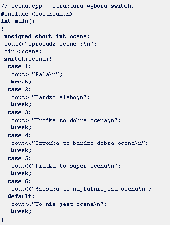 Po wprowadzeniu wartości zmiennej poprzez instrukcję cin<<ocena; struktura switch zostaje uruchomiona. Wartość wyraŜenia sterującego mającego postać (ocena) porównywana jest z