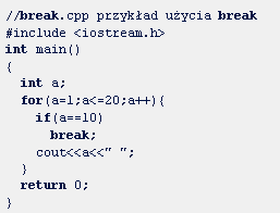 break powoduje, Ŝe wykonanie programu jest kontynuowane od pierwszej instrukcji po