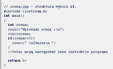 zmiennej ocena będzie mniejsza od trzech, wyświetlony będzie napis "Nie zdales", po tym będą wykonywane kolejne instrukcje programu.