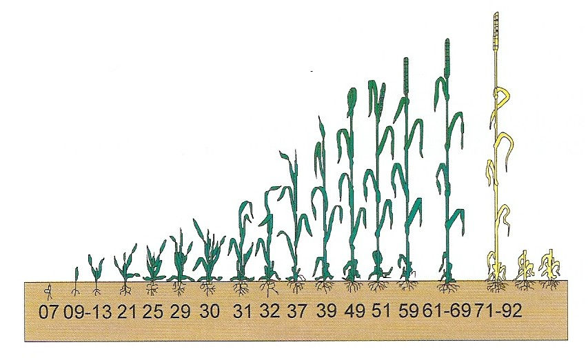 1, 2 Liść jest rozwinięty wówczas, gdy widoczny jest jego języczek (ligula) lub szczyt następnego liścia 3 Krzewienie lub wydłużenie łodygi może nastąpić wcześniej niż w fazie 13, wówczas opis kontynuowany jest w fazie 21.Jeżeli wydłużenie pędu zaczyna się przed końcem krzewienia wówczas opis kontynuowany jest w fazie 30