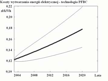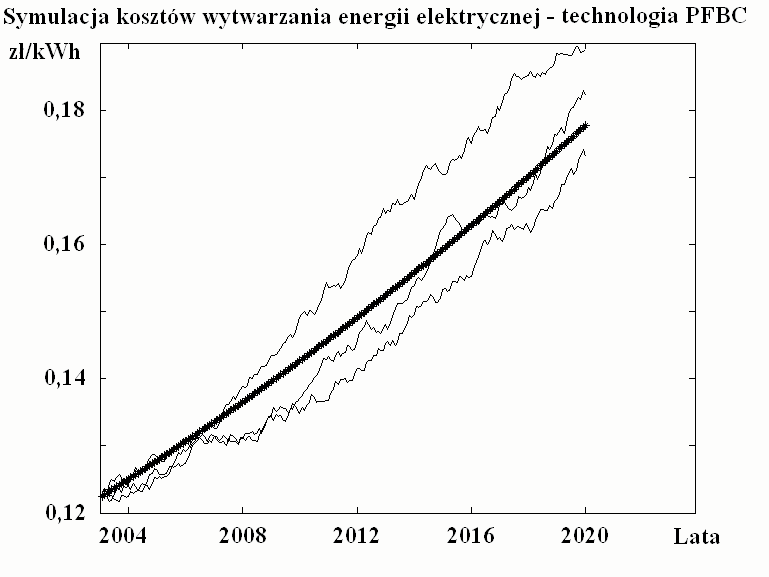 Rys. 1. Symulacja kosztów wytwarzania energii elektrycznej (trzy przebiegi) z zaznaczon¹ prognoz¹ (linia pogrubiona) dla technologii PFBC
