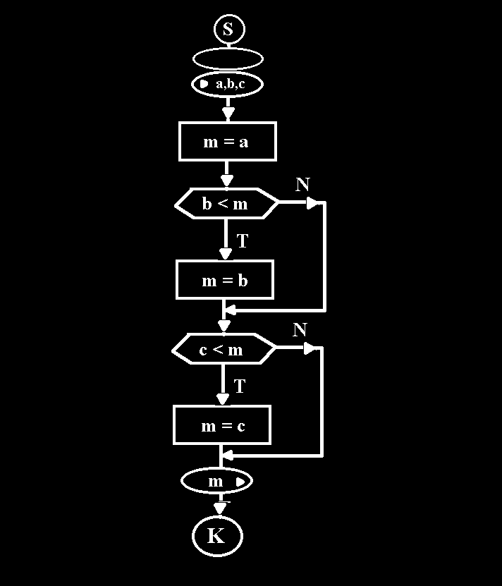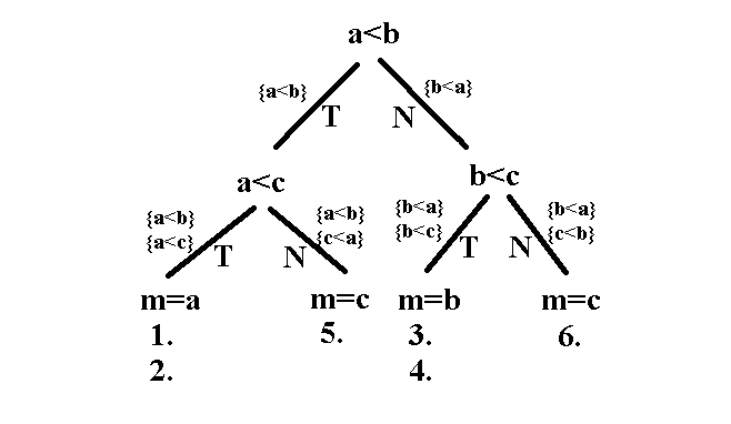 Mając trzy różna liczby a,b,c, wyznaczyć liczbę m , tak aby m =a lub m = b lub m = c, przy czym m ≤ a , m ≤ b , m ≤ c.